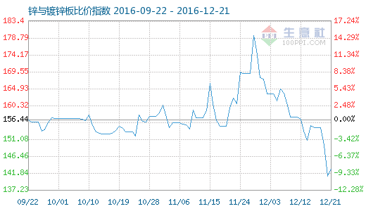 12月21日鋅與鍍鋅板比價指數(shù)為142.97